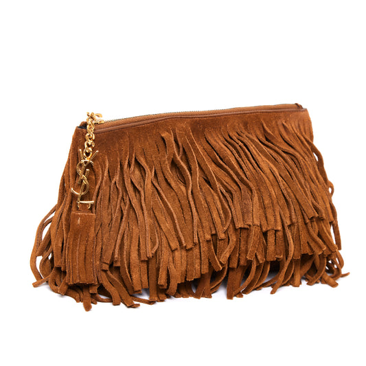 SAINT LAURENT Suede Fringe Medium Clutch Light Ocre