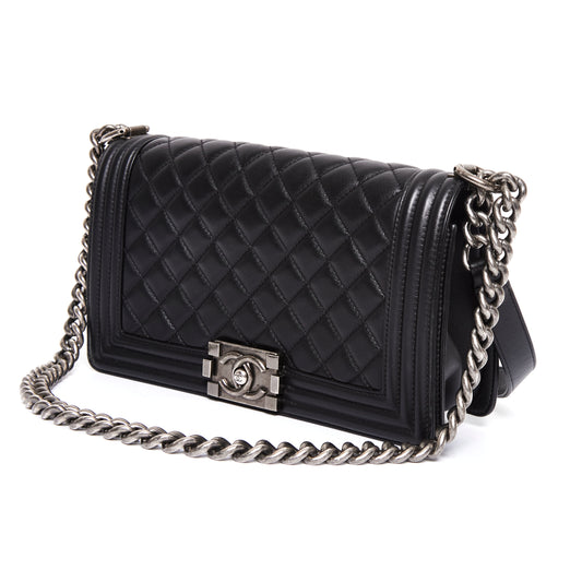 CHANEL Black Lambskin Quilted Old Medium Boy Flap Bag