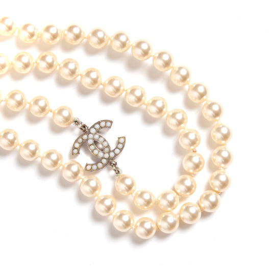 CHANEL Classic Silver CC 72"pearl long necklace