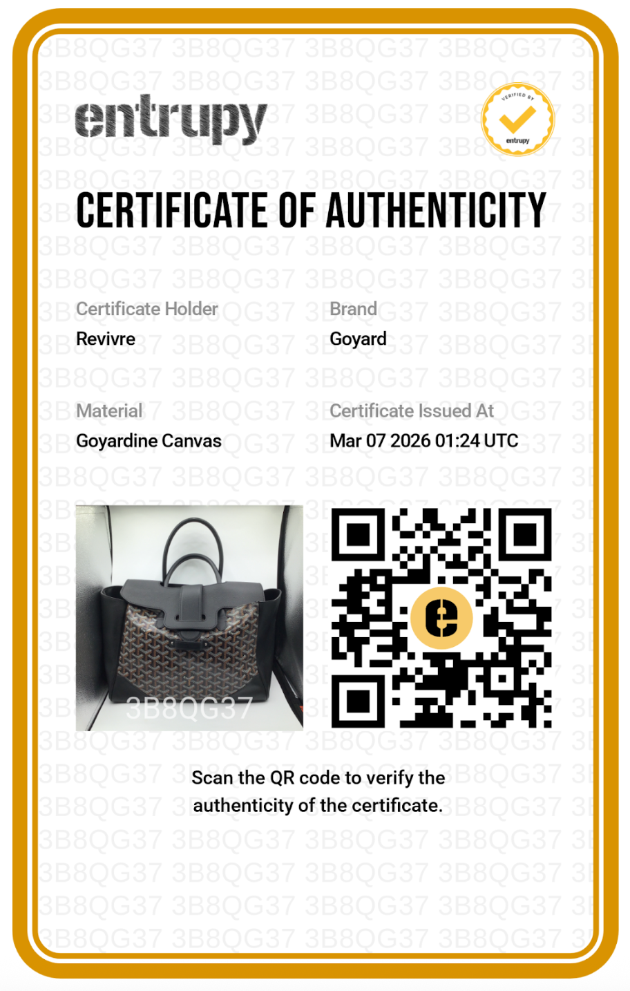 Every authenticated item includes an official Entrupy Certificate of Authenticity Card.