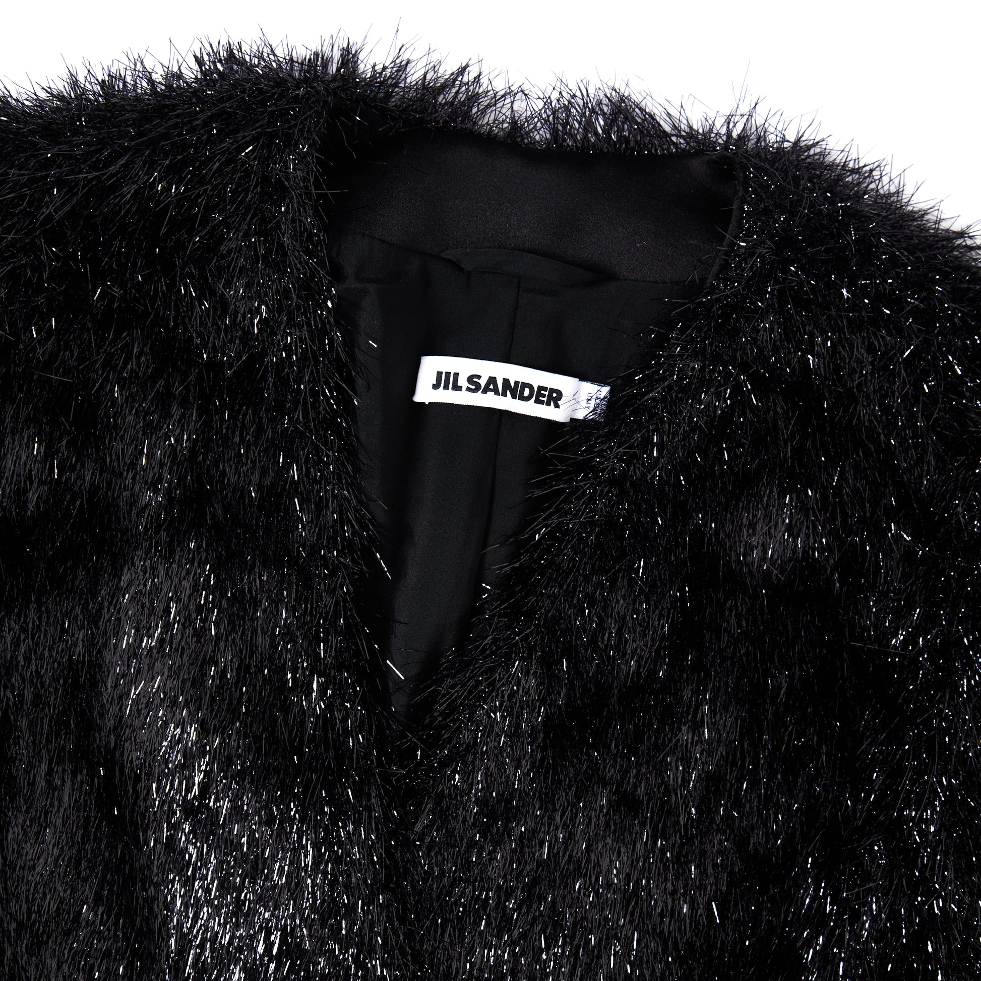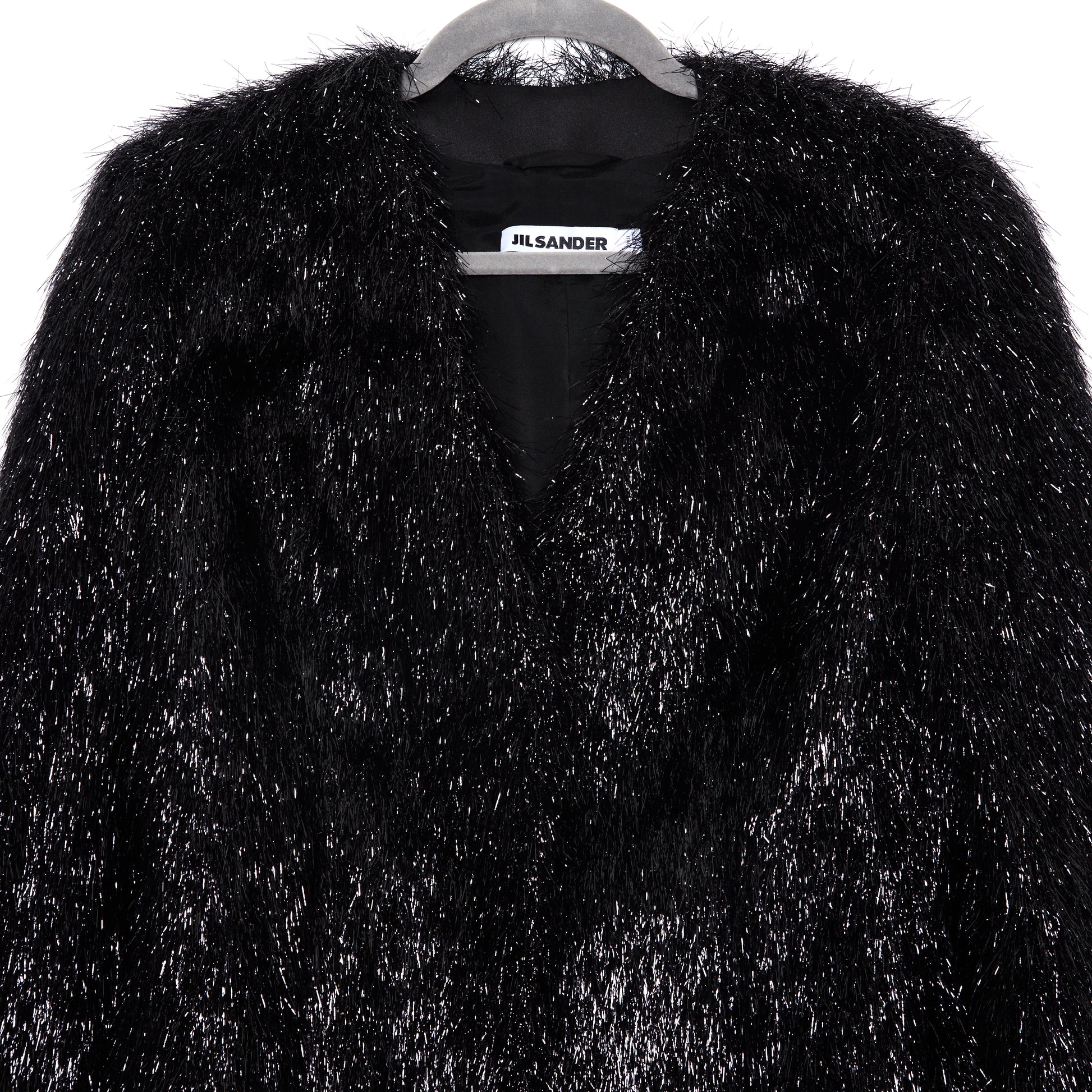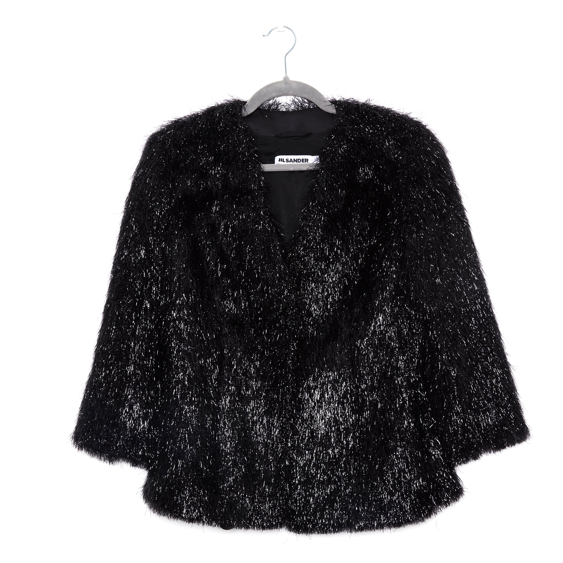 Jil Sander Shimmer Textured Cropped Jacket – a bold twist on minimalist tailoring. Crafted from black fabric woven with metallic threads, it features a high-pile, feathered texture that shimmers with movement. The cropped, boxy fit includes a V-neckline, cropped sleeves, and a sleek two-button front. Fully lined for comfort, it’s a striking piece for evening wear or modern suiting.