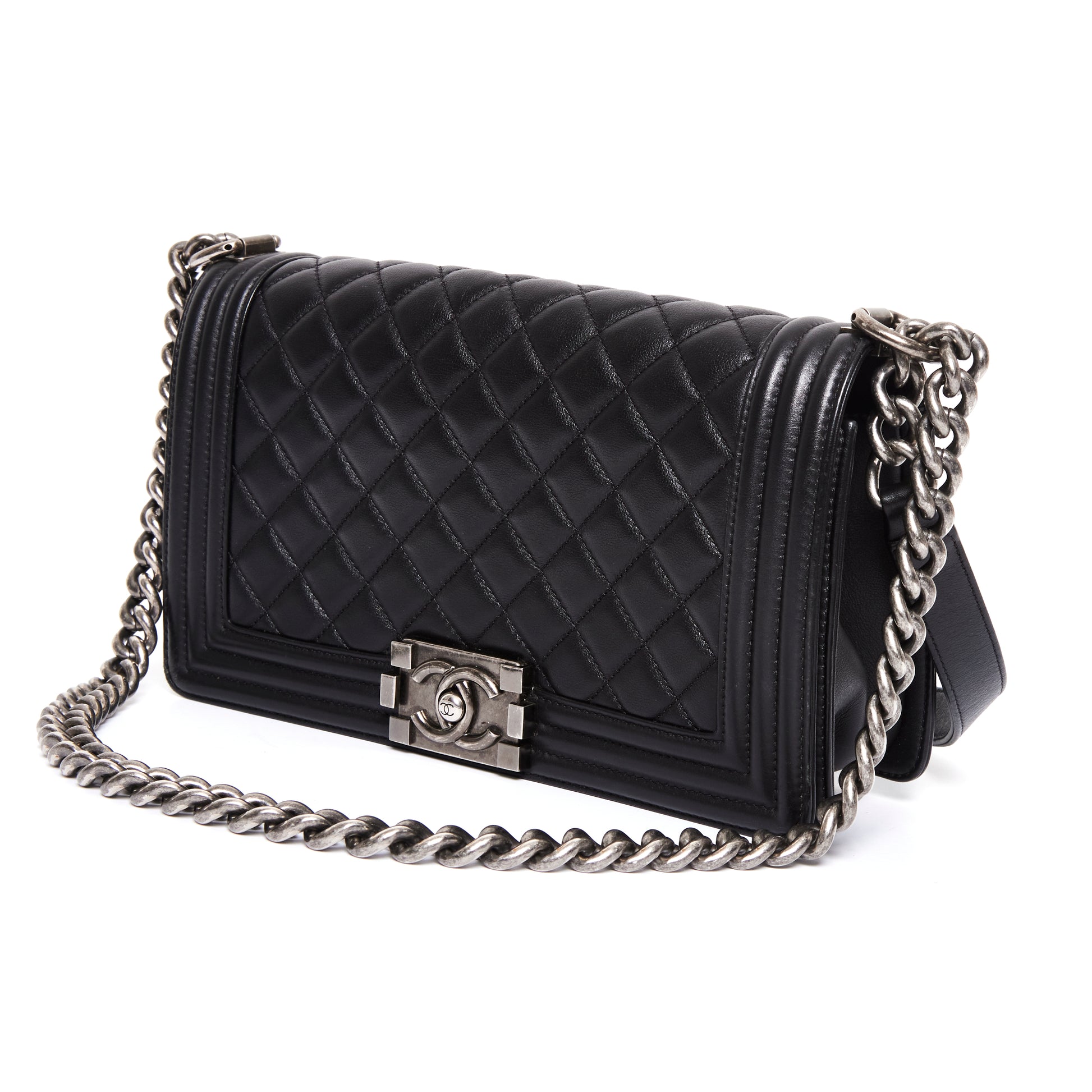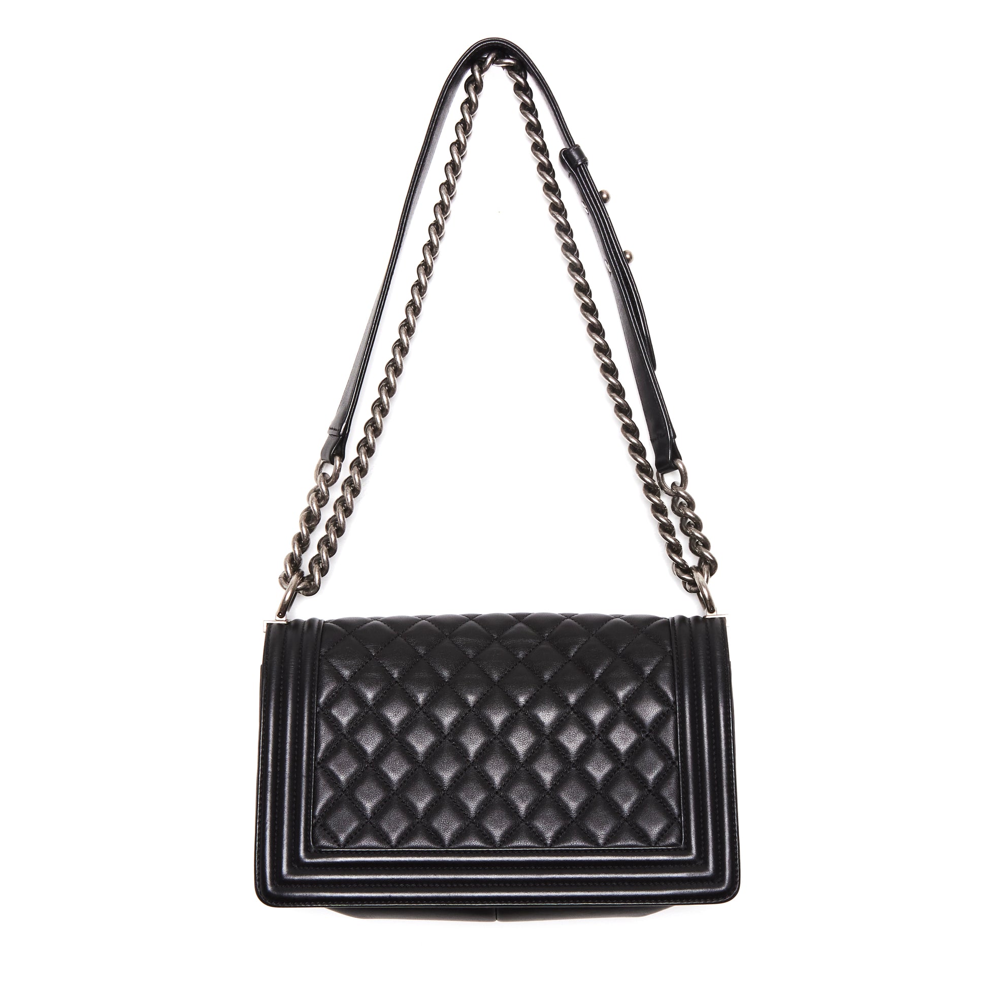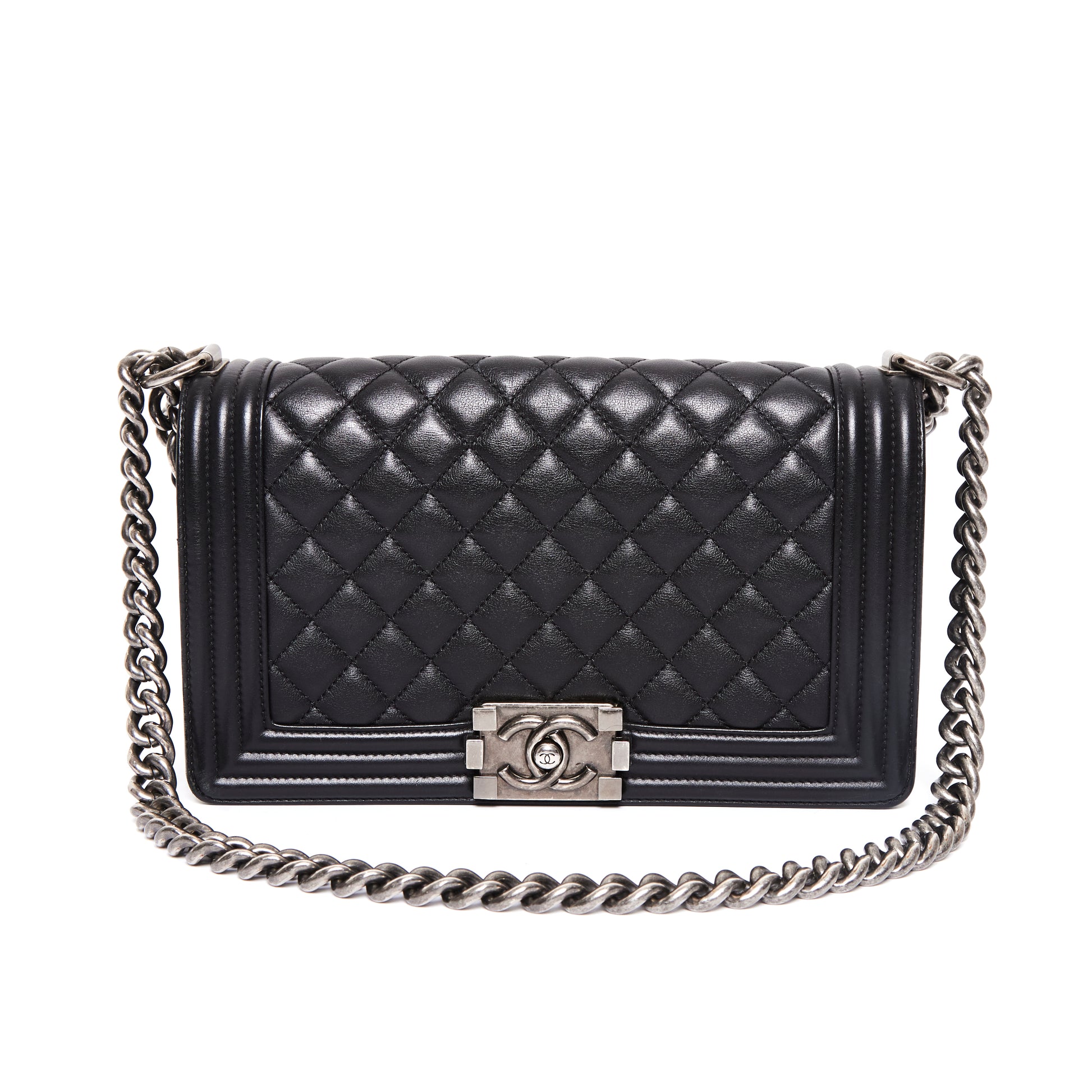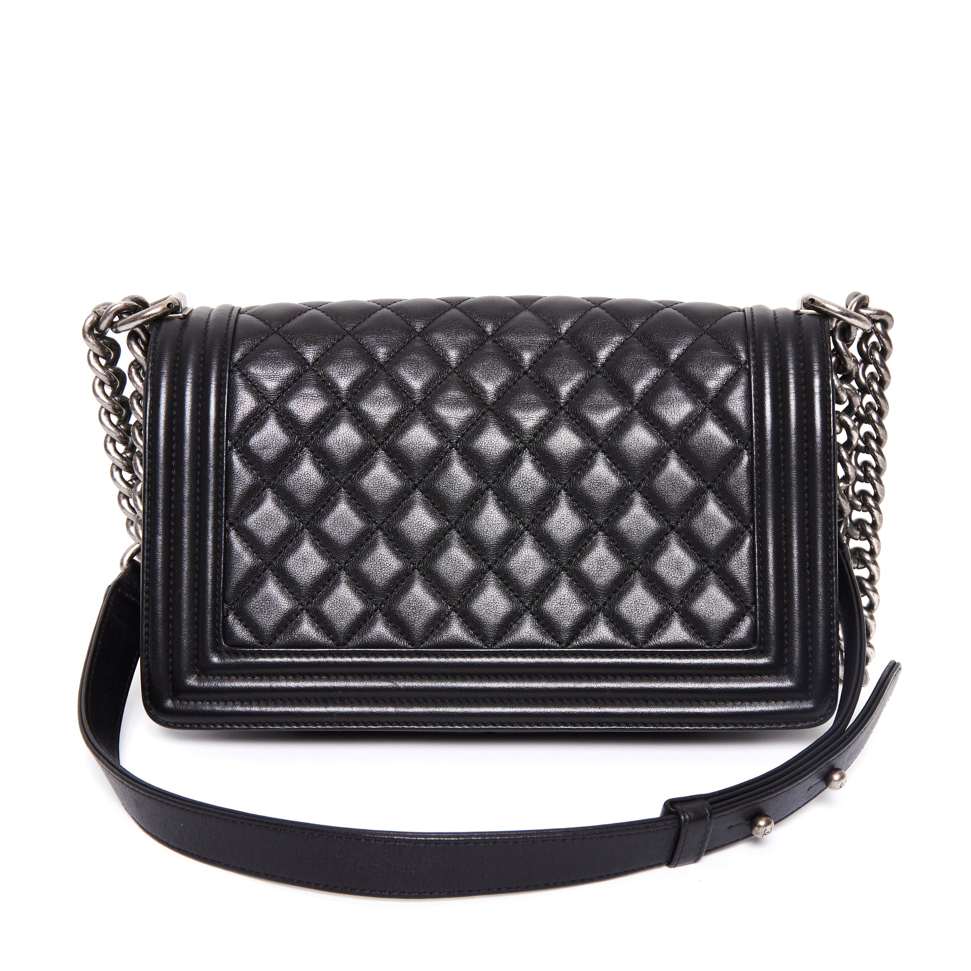 Chanel Boy Medium Flap Bag – crafted from soft black lambskin with signature diamond quilting and antique ruthenium CC clasp. Features a structured silhouette, flap with press-lock closure, and a chunky chain-leather strap for shoulder or crossbody wear. Spacious enough for everyday essentials with a fabric-lined interior and slip pocket.
