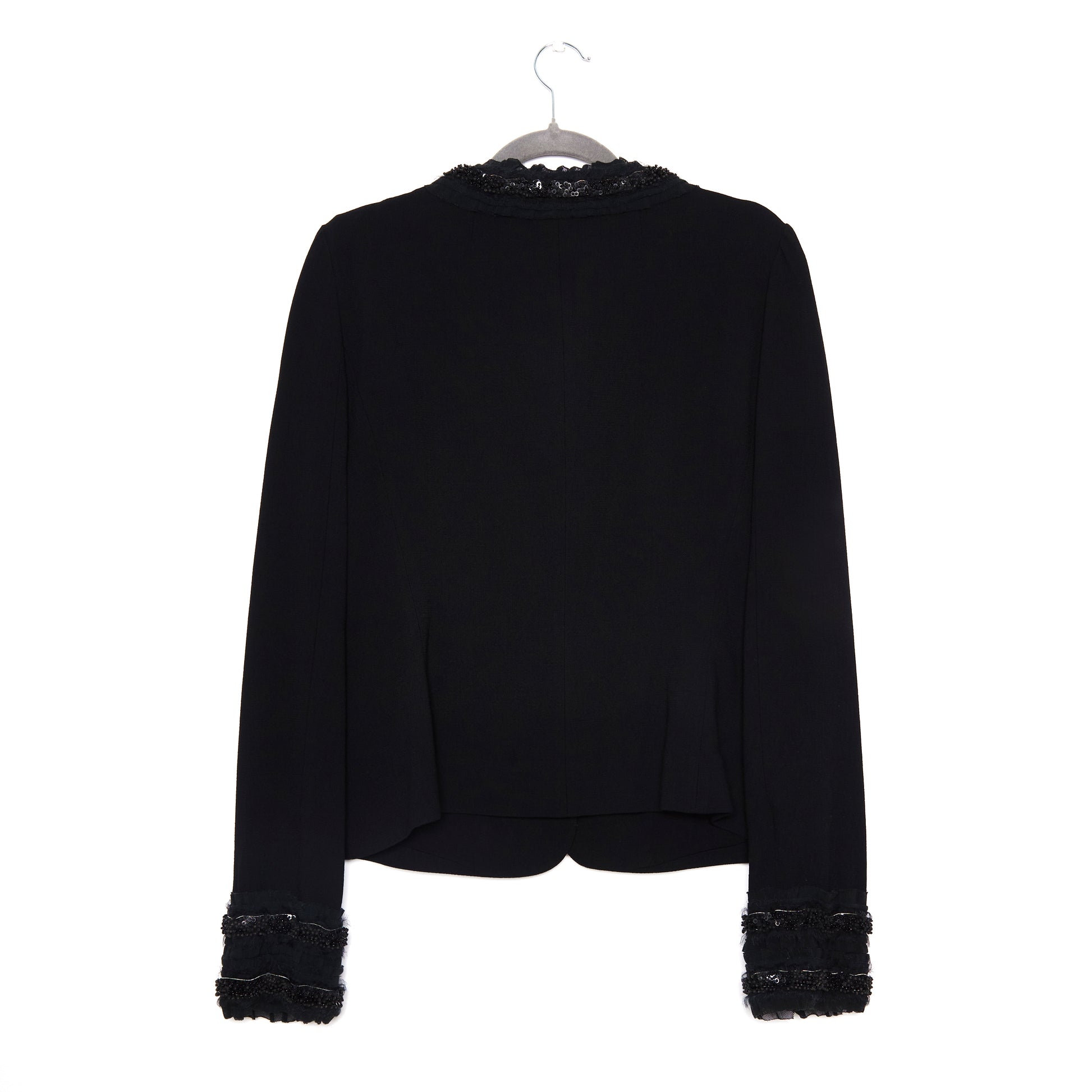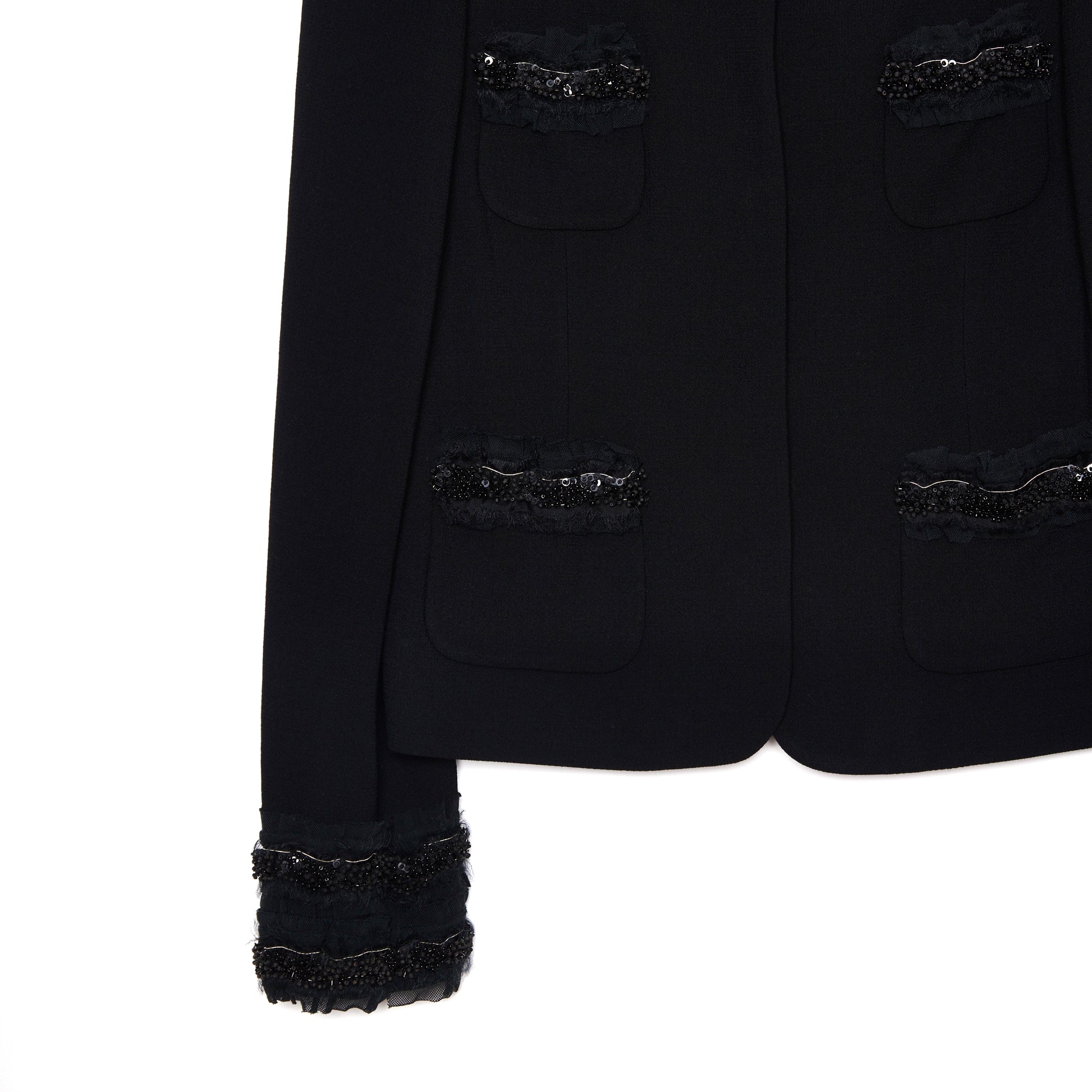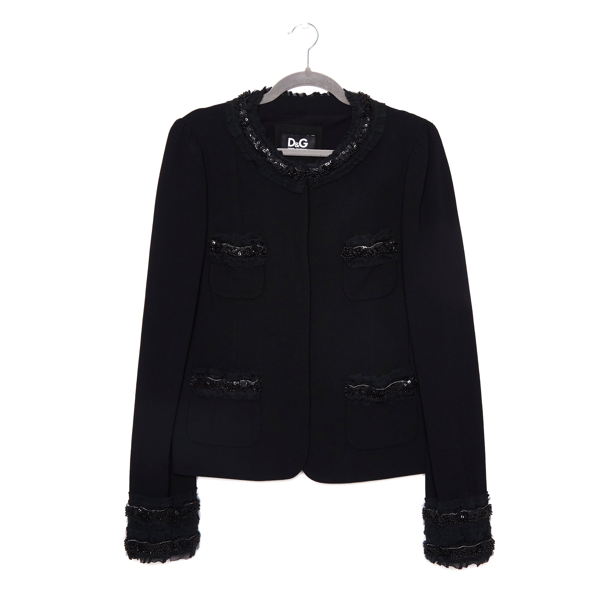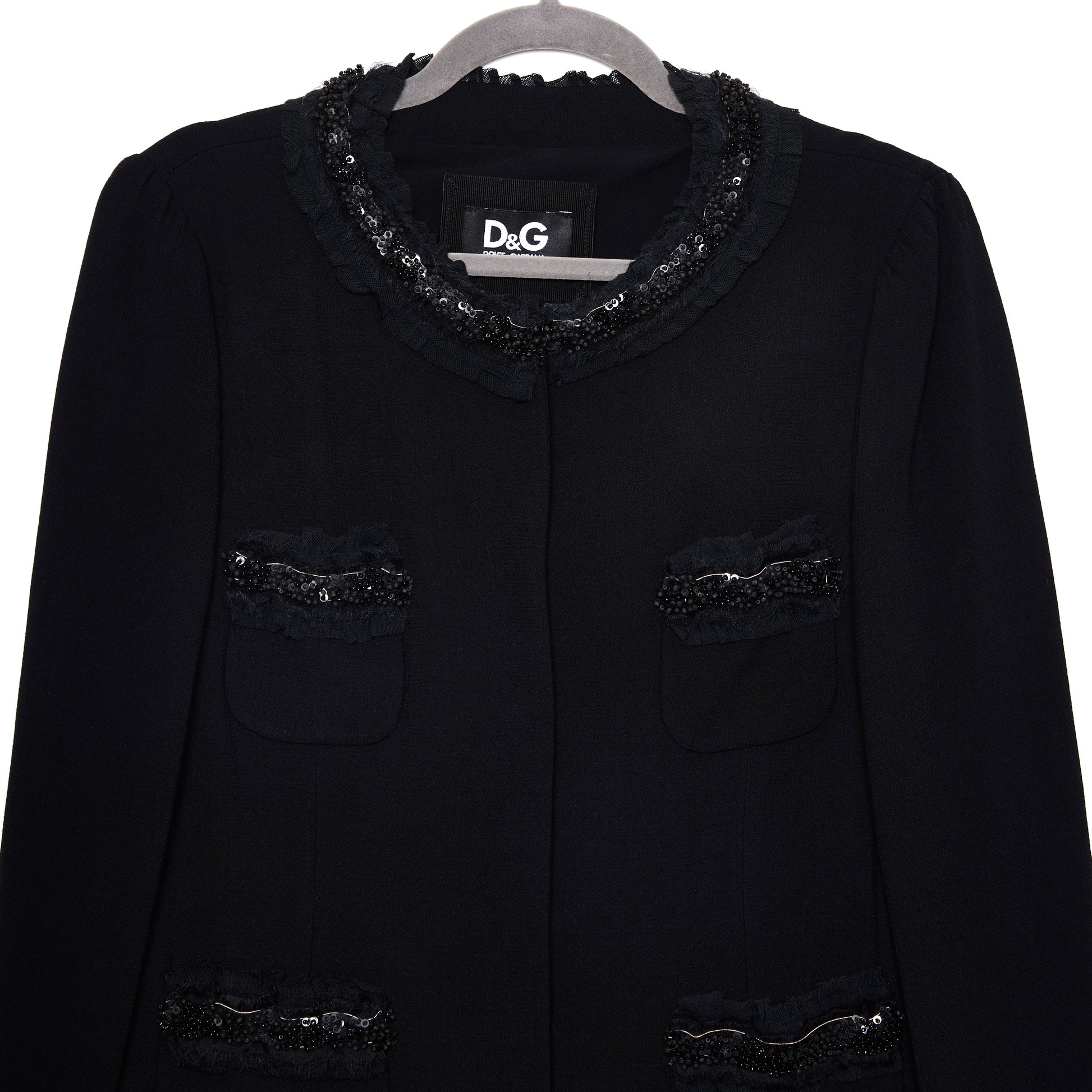VINTAGE piece: Elegant and structured, this D&G black cropped jacket features sequin-embellished fringe detailing at the collar, cuffs, and four front pockets. A timeless piece with luxe texture, perfect for elevating any outfit.