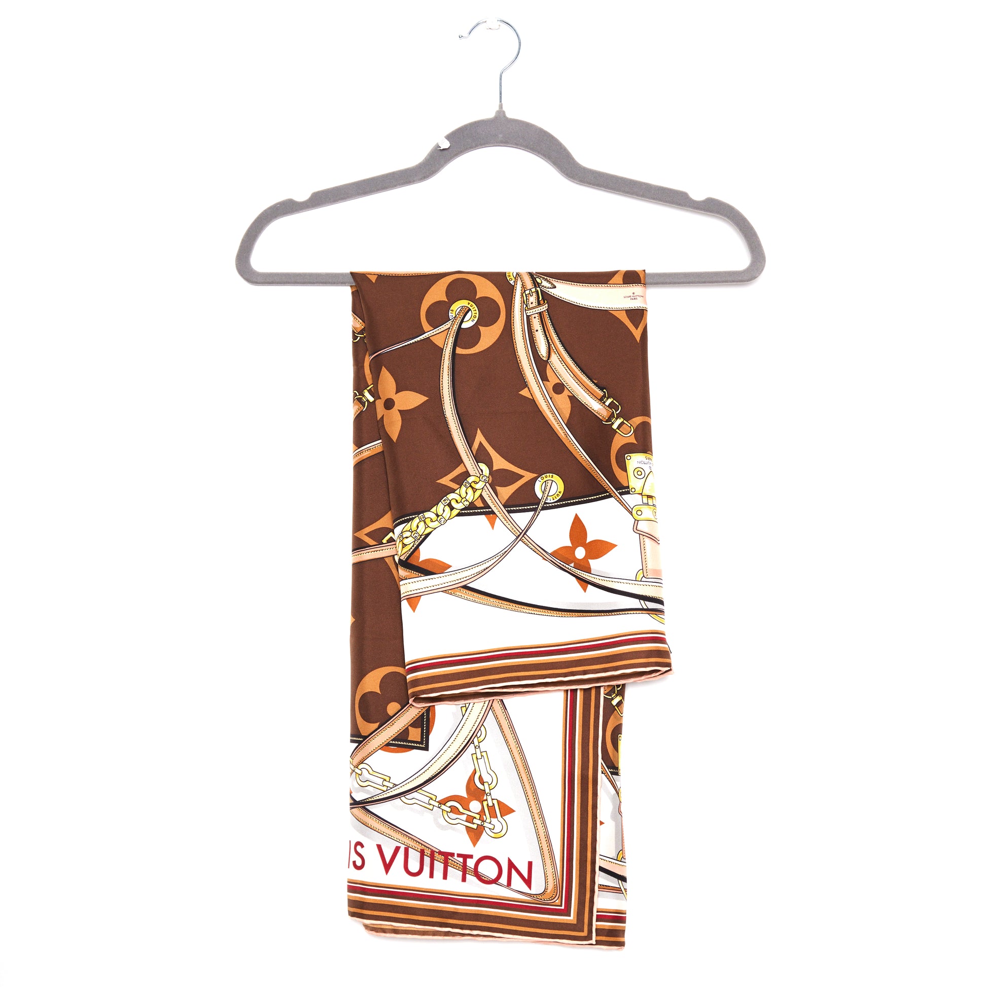 A luxurious Louis Vuitton silk scarf featuring the signature LV monogram with equestrian-inspired belt and chain detailing. Crafted in a rich palette of brown, orange, and gold tones with "Louis Vuitton" branding at the border. A timeless accessory that adds elegance to any outfit.