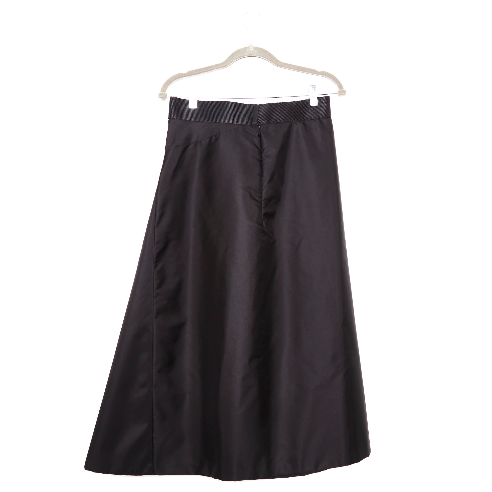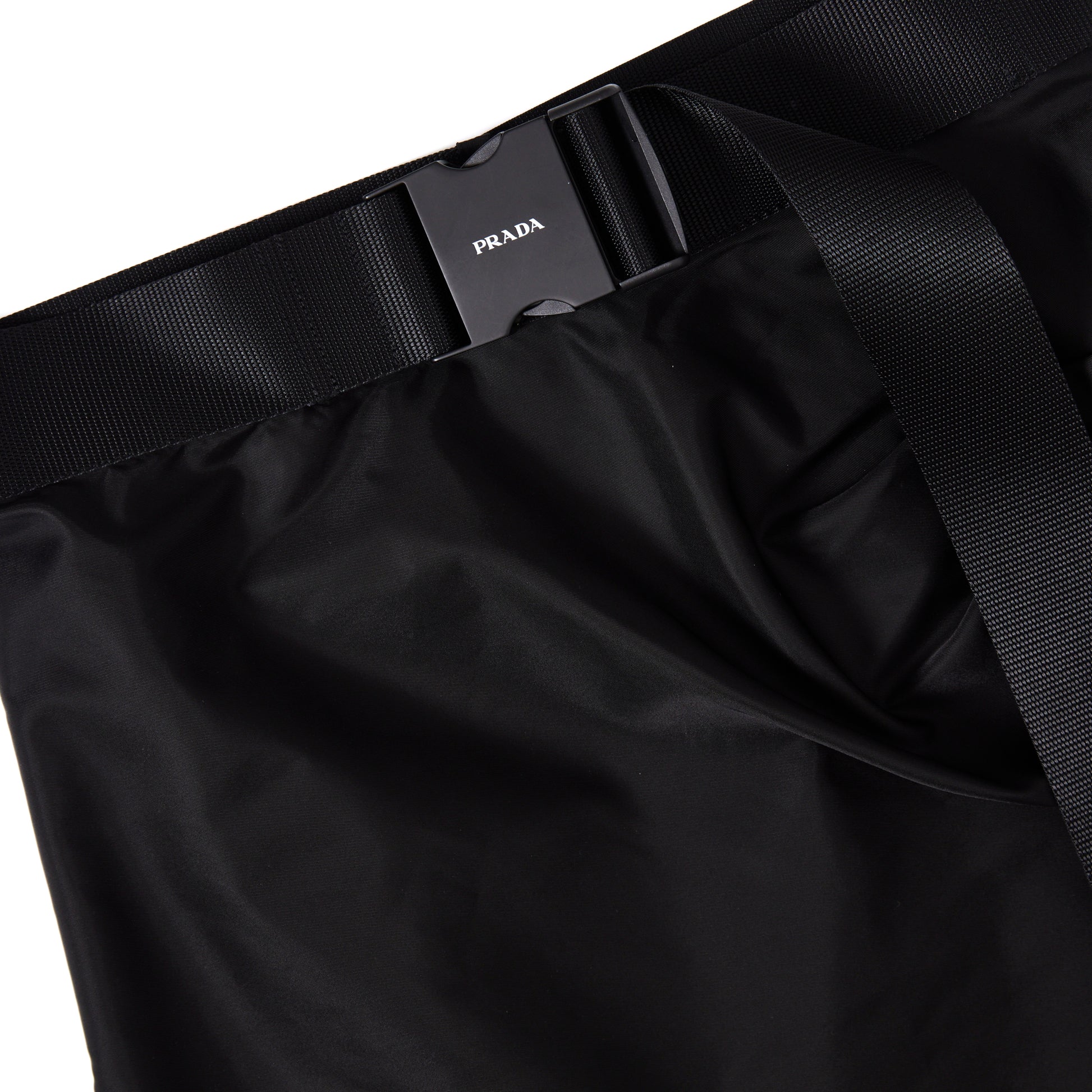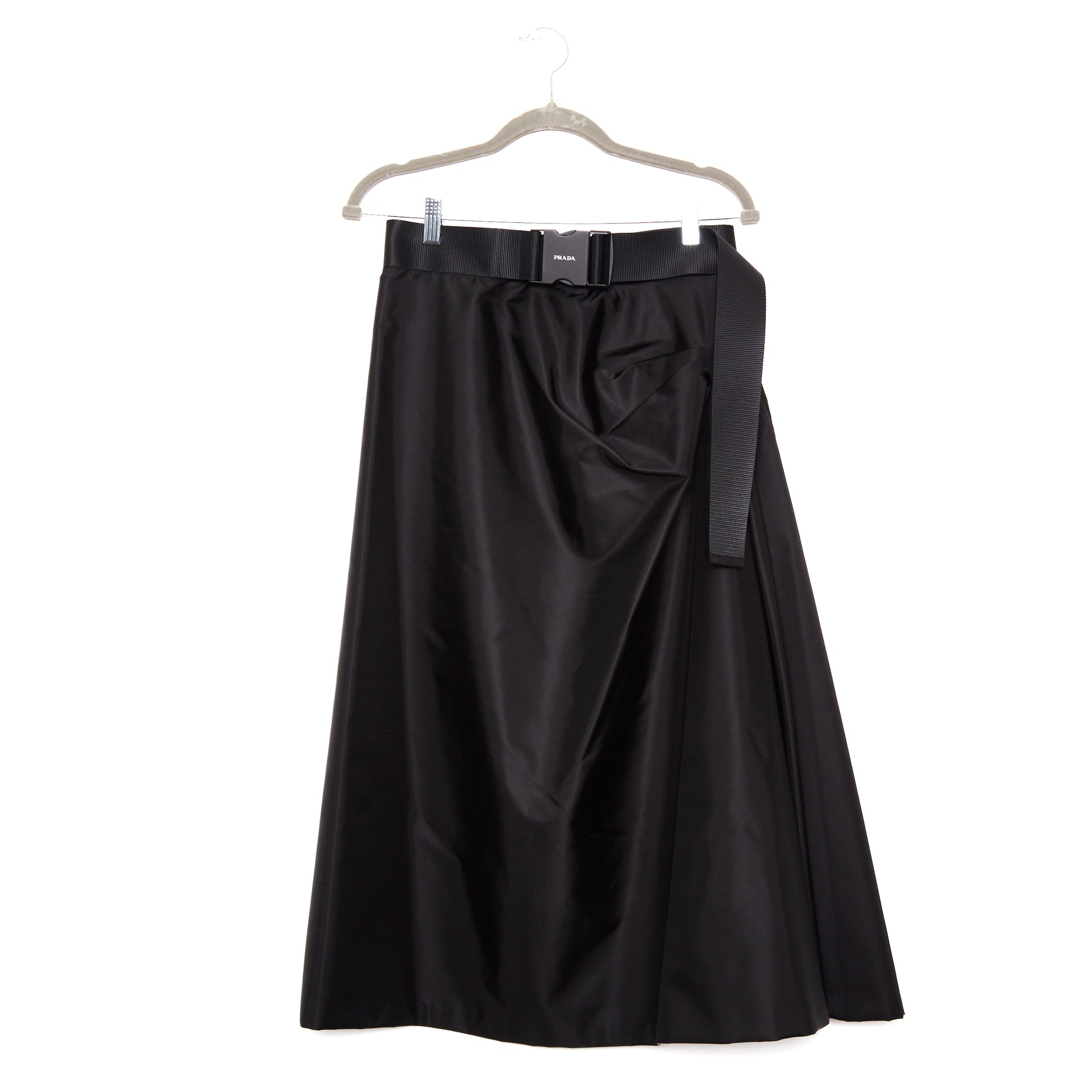 Elevate your wardrobe with this sleek Prada Gabardine Nylon Skirt. Crafted from smooth, slightly shiny nylon fabric, this knee-length skirt features a minimalist design with clean lines. The adjustable belt with a buckle at the waist adds a touch of practicality and style. Perfect for both casual and formal occasions, this skirt embodies Prada's signature elegance and sophistication.